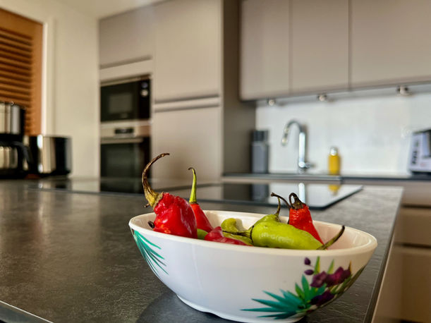 La terrasse dessert un salon lumineux avec canapé-lit d'appoint et coin TV, ouvert sur une cuisine moderne entièrement équipée (frigo, congélateur, four, four micro-ones, lave vaisselle, robot de cuisine) doublée d'une buanderie - lingerie avec lave linge et d'un wc indépendant.