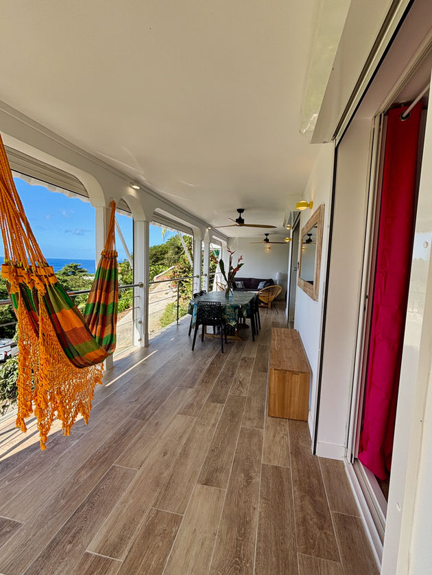 Terrasse couverte privative de 40 m2, espace détente avec vue à couper le souffle sur la mer des Caraïbes et ses magnifiques couchers de soleil. Canapés et hamac favorisent relaxation et convivialité. Vous percevez de cette terrasse le ruissellement continu et apaisant de l'incroyable débordement de la piscine de la prestigieuse Villa MANA située à l'étage supérieur.