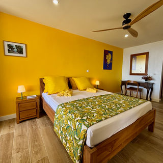 Notre chambre "Terre de Bas" dispose également d'une vue mer avec accès direct à la terrasse, ainsi que d'un lit double 180 cm (convertible en 2 lits simples de 90 cm sur demande), grands placards avec penderies, salle de bain avec baignoire-îlot et lavabo simple vasque. Elle est climatisée.